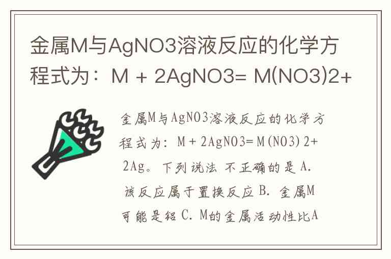 置换反应的特征是“单质+化合物→新单质+新化合物”。方程式中,单质 与化合物 反应,生成新单质 \(Ag\) 和新化合物 \(M(NO_3)_2\),完全符合置换反应定义。A正确。