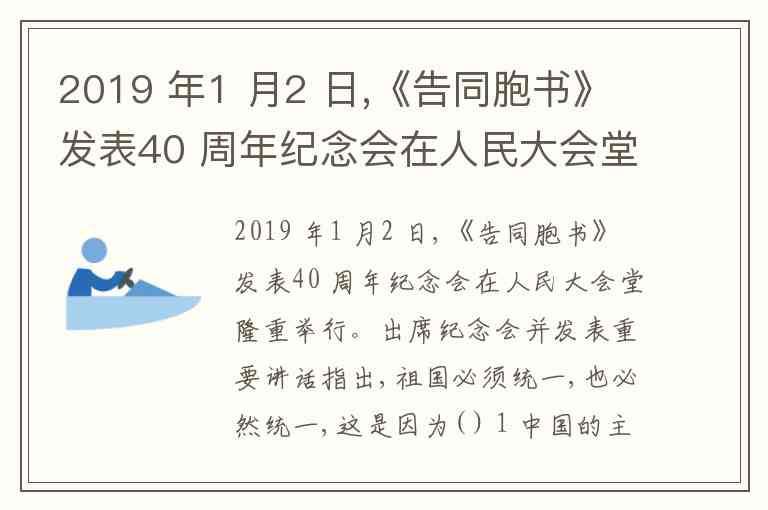 2019 年1 月2 日,《告同胞书》发表40 周年纪念会在人民大会堂隆重举行。出席纪念会并发表重要讲话指出,祖国必须统一,也必然统一,这是因为( ) 1 中国的主权和领土完整不容分割 2 维护民族团结是每个公民的法定义务 3 社会主义制度具有无比的优越性 4 祖国统一是中华民族的根本利益所在 A. ②③ B. ①③ C. ①④ D. ②④