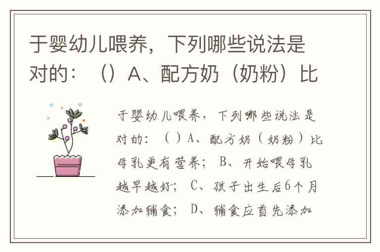 于婴幼儿喂养,下列哪些说法是对的:()A、配方奶(奶粉)比母乳更有营养; B、开始喂母乳越早越好; C、孩子出生后6个月添加辅食; D、辅食应首先添加谷物类的; E、不知道。