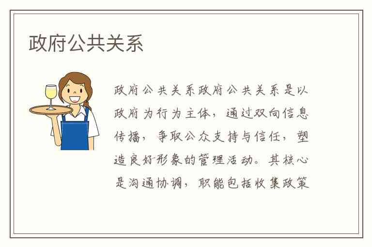 政府公共关系是以政府为行为主体,通过双向信息传播,争取公众支持与信任,塑造良好形象的管理活动。其核心是沟通协调,职能包括收集政策、公众需求等信息,提供决策咨询,协调内外部关系,宣传引导政策,管理舆情与危机。目标是