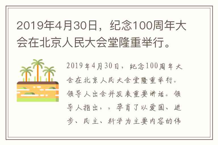 2019年4月30日纪念五四运动100周年大会上,习近平总书记指出,五四运动孕育了以爱国、进步、民主、科学为