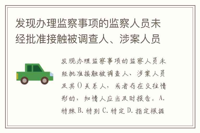 发现办理监察事项的监察人员未经批准接触被调查人、涉案人员及其()关系人,或者存在交往情形的,知情人应当及时报告。A.特殊 B.特别 C.特定 D.指定