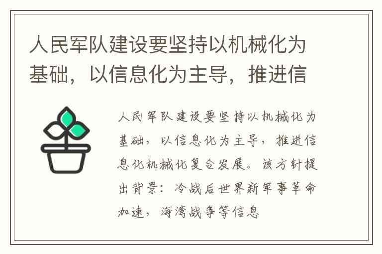 人民军队建设要坚持以机械化为基础,以信息化为主导,推进信息化机械化复合发展。