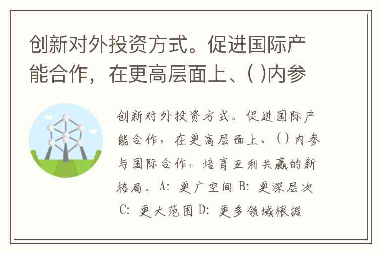 创新对外投资方式。促进国际产能合作,在更高层面上、( )内参与国际合作,培育互利共赢的新格局。A: 更广空间 B: 更深层次 C: 更大范围 D: 更多领域