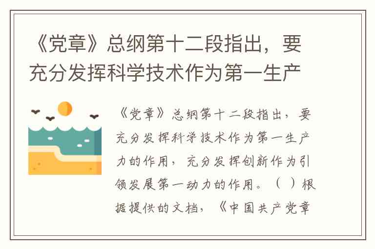 《党章》总纲第十二段指出,要充分发挥科学技术作为第一生产力的作用,充分发挥创新作为引领发展第一动力的作用。( )