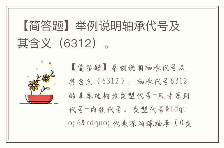 【简答题】举例说明轴承代号及其含义(6312)。