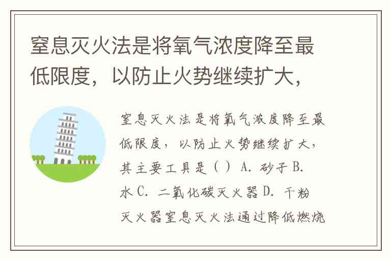 窒息灭火法是将氧气浓度降至最低限度,以防止火势继续扩大,其主要工具是() A. 砂子 B. 水 C. 二氧化碳灭火器 D. 干粉灭火器