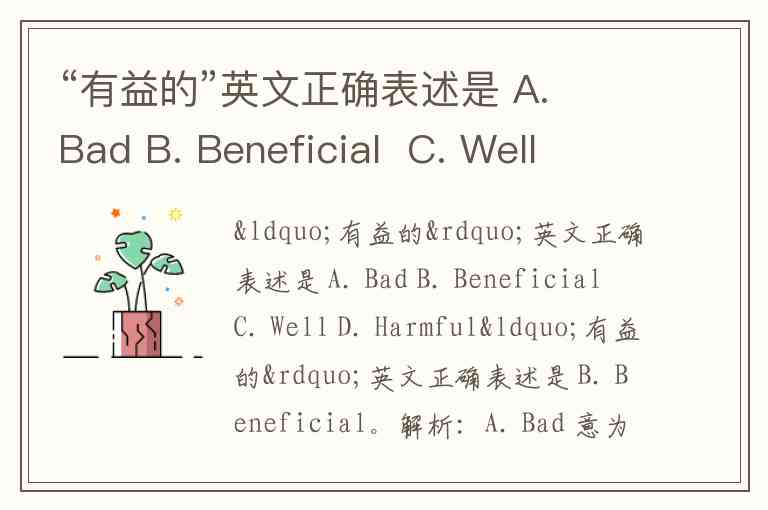 “有益的”英文正确表述是 A. Bad B. Beneficial C. Well D. Harmful
