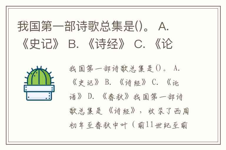 我国第一部诗歌总集是()。 A. 《史记》 B. 《诗经》 C. 《论语》 D. 《春秋》