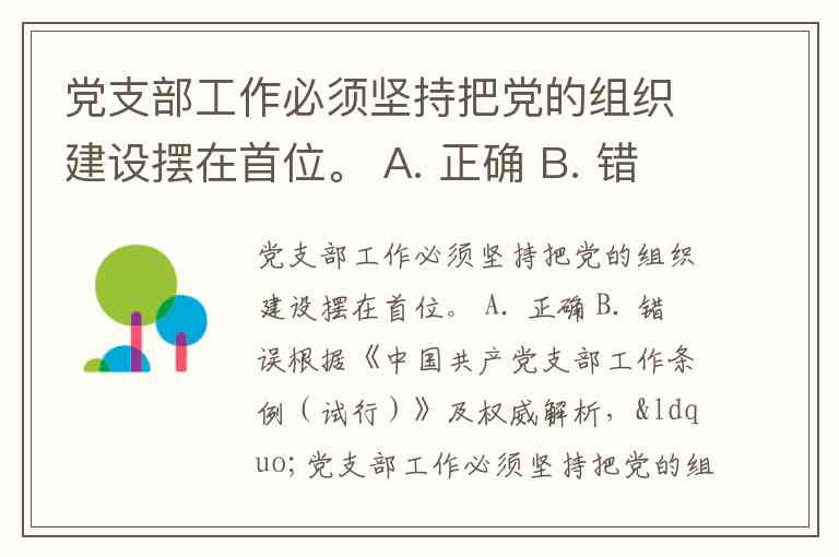 党支部工作必须坚持把党的组织建设摆在首位。 A. 正确 B. 错误