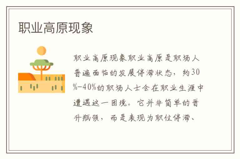 职业高原是职场人普遍面临的发展停滞状态,约30%-40%的职场人士会在职业生涯中遭遇这一困境。它并非简单的晋升瓶颈,而是表现为职位停滞、工作满意度下降、职业倦怠等多维度困境,如同一位资深项目经理发现"晋升机会减少,创新和挑战性工作变得稀缺"的状态。这种现象在工作5年后尤为突出,某调查显示此时超30%员工会陷入职业高原,而在竞争激烈的企业中这一比例更高。