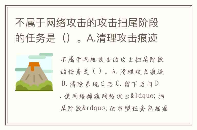 不属于网络攻击的攻击扫尾阶段的任务是()。A.清理攻击痕迹 B.清除系统日志 C.留下后门 D.使网络瘫痪