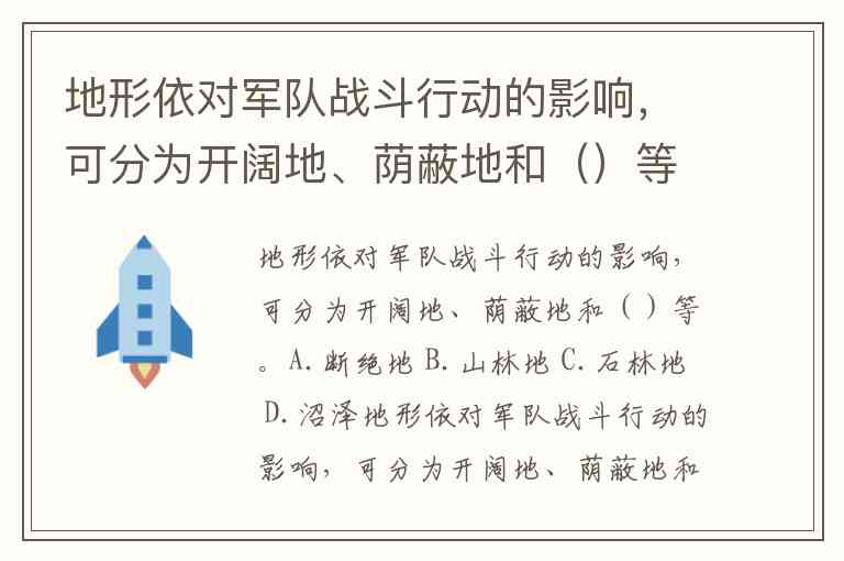 地形依对军队战斗行动的影响,可分为开阔地、荫蔽地和()等。A.断绝地 B.山林地 C.石林地 D.沼泽