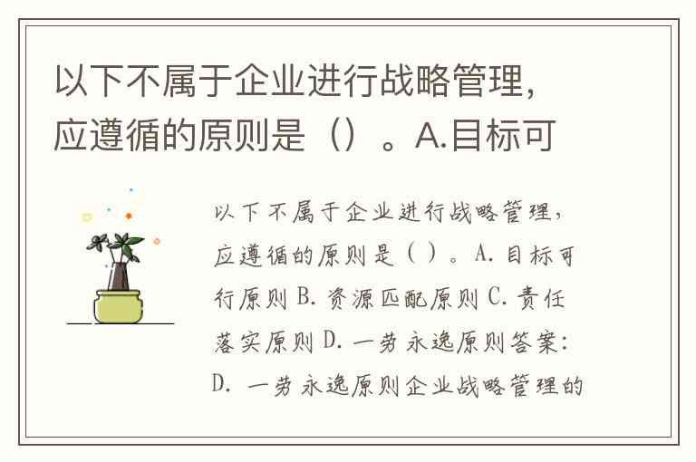 以下不属于企业进行战略管理,应遵循的原则是()。A.目标可行原则 B.资源匹配原则 C.责任落实原则 D.一劳永逸原则