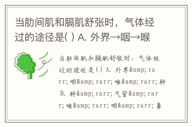 当肋间肌和膈肌舒张时,气体经过的途径是( ) A. 外界→咽→喉→肺 B. 肺→气管→喉→咽→鼻腔→外界 C. 外界→鼻→咽→喉→气管→肺 D. 肺→气管→咽→外界