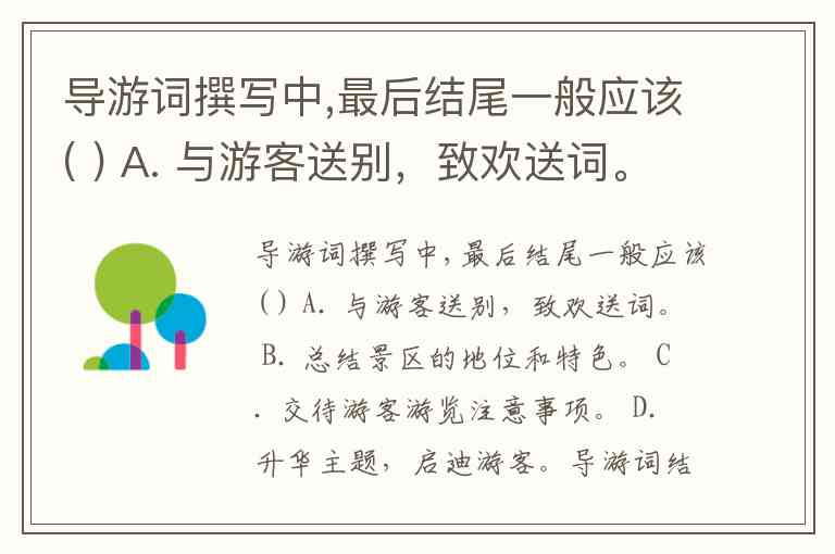 相比之下,A选项属于送别环节的独立内容,通常在导游词主体结束后单独表达;B选项的总结功能应在结尾前完成;C选项的注意事项则需在游览开始前或关键节点提醒。因此,在导游词文本的结尾段落,升华主题、启迪思考才是核心任务,它能使导游词从单纯的信息介绍升华为富有感染力的文化传播。