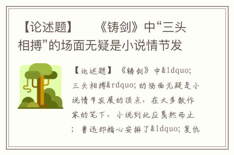 【论述题】 《铸剑》中“三头相搏”的场面无疑是小说情节发展的顶点,在大多数作家的笔下,小说到此应戛然而止;鲁迅却精心安排了“复仇完成以后”情节的新的发展,小说又出现了一个高潮。 试分析小说前后两个高潮之间的关系;比较前后的文字,作者的叙述语调发生了什么变化。