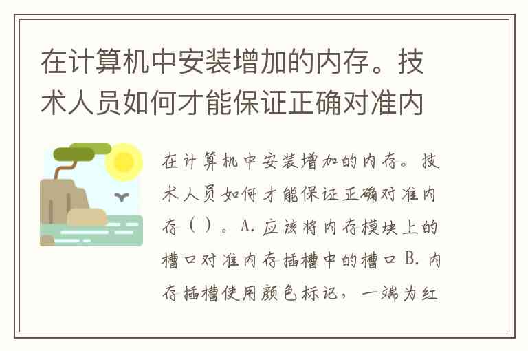 在计算机中安装增加的内存。技术人员如何才能保证正确对准内存()。A.应该将内存模块上的槽口对准内存插槽中的槽口 B.内存插槽使用颜色标记,一端为红色,另一端为蓝色 C.内存模块上的标签应该始终面向CPU D.应该将内存模块上的箭头对准主板插槽上的箭头