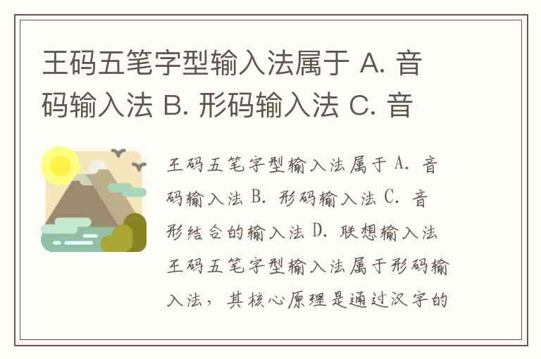 王码五笔字型输入法属于 A. 音码输入法 B. 形码输入法 C. 音形结合的输入法 D. 联想输入法