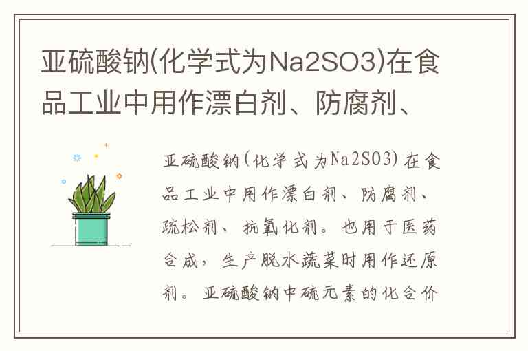 要确定亚硫酸钠(Na₂SO₃)中硫元素的化合价,需依据化合物中各元素化合价代数和为零的原则。已知钠元素(Na)通常显+1价,氧元素(O)通常显-2价,设硫元素(S)的化合价为。