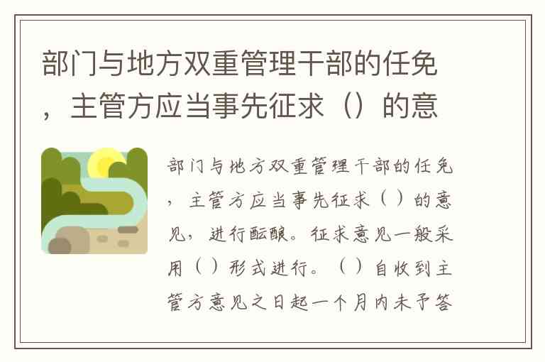 部门与地方双重管理干部的任免,主管方应当事先征求()的意见,进行酝酿。征求意见一般采用()形式进行。()自收到主管方意见之日起一个月内未予答复的,视为()。双方意见不一致时,正职的任免报上级党委组织部门协调,副职的任免由()决定。