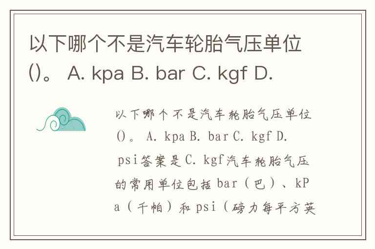 以下哪个不是汽车轮胎气压单位()。 A. kpa B. bar C. kgf D. psi
