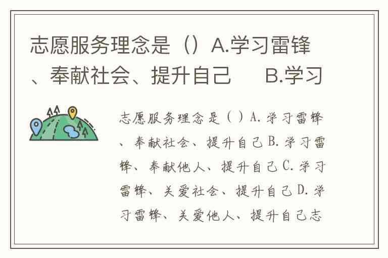 志愿服务理念是()A.学习雷锋、奉献社会、提升自己 B.学习雷锋、奉献他人、提升自己 C.学习雷锋、关爱社会、提升自己 D.学习雷锋、关爱他人、提升自己