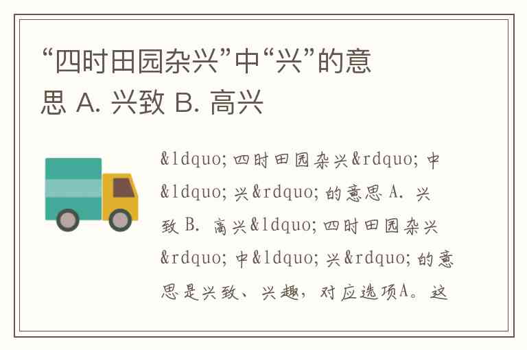 “四时田园杂兴”中“兴”的意思是兴致、兴趣,对应选项A。这一解释得到多份资料支持,如文献指出“兴”在此处意为“兴致、兴趣”,也可引申为“情感、情致”,整句可理解为“春夏秋冬四季中田园生活的各种情趣与感受”。同时,“杂兴”指随兴创作的诗篇,体现诗人因田园景物触发的即兴感想。