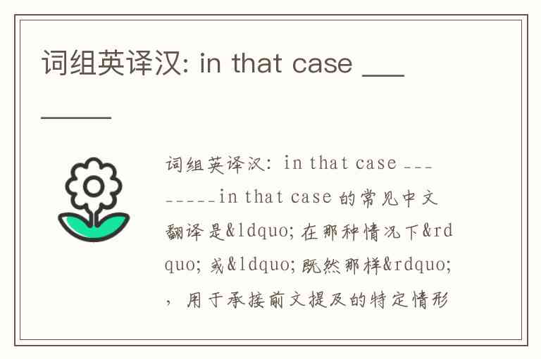 in that case 的常见中文翻译是“在那种情况下”或“既然那样”,用于承接前文提及的特定情形并引出相应的结论或应对方式。例如:The flight is canceled? In that case, we'll have to reschedule our trip.(航班取消了?在那种情况下,我们就得重新安排行程了。)