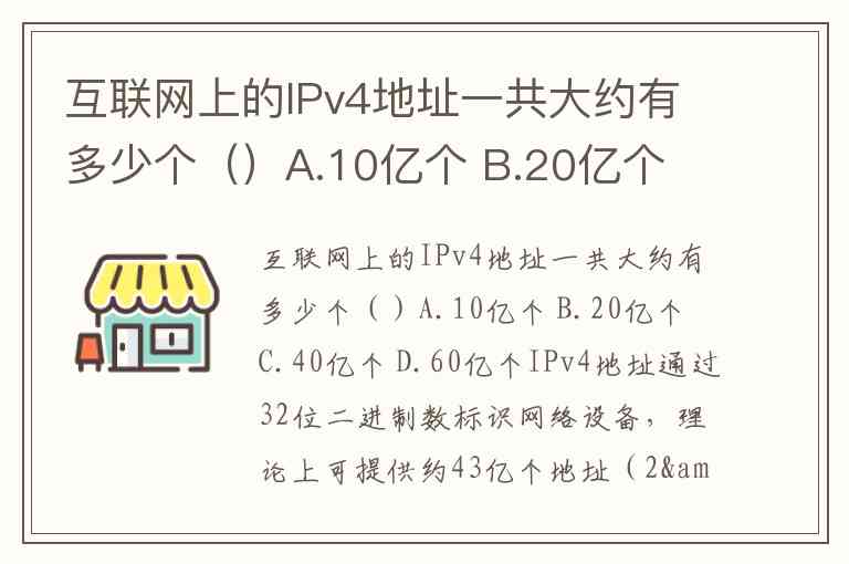 互联网上的IPv4地址一共大约有多少个()A.10亿个 B.20亿个 C.40亿个 D.60亿个