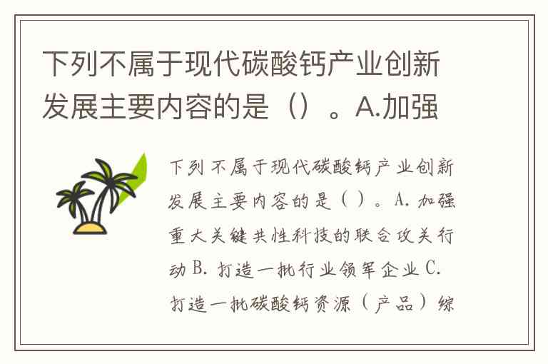 下列不属于现代碳酸钙产业创新发展主要内容的是()。A.加强重大关键共性科技的联合攻关行动 B.打造一批行业领军企业 C.打造一批碳酸钙资源(产品)综合利用的实验室、检测中心和孵化器 D.打造东盟碳酸钙产业公共服务平台