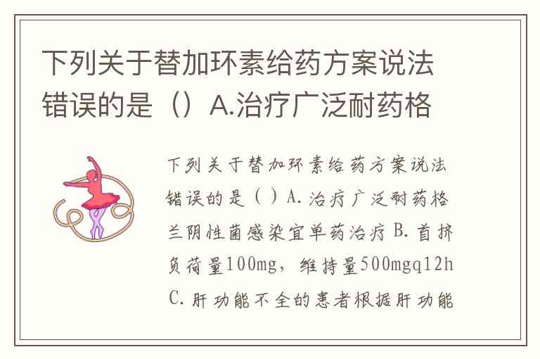 关于替加环素给药方案的错误说法是A. 治疗广泛耐药革兰阴性菌感染宜单药治疗和B. 首剂负荷量100mg,维持量500mg q12h。以下是具体分析: