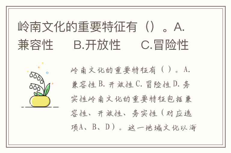 岭南文化的重要特征有()。A.兼容性 B.开放性 C.冒险性 D.务实性