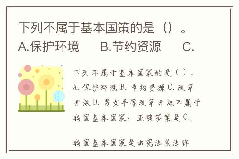 下列不属于基本国策的是()。A.保护环境 B.节约资源 C.改革开放 D.男女平等