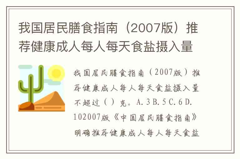 我国居民膳食指南(2007版)推荐健康成人每人每天食盐摄入量不超过()克。A.3 B.5 C.6 D.10