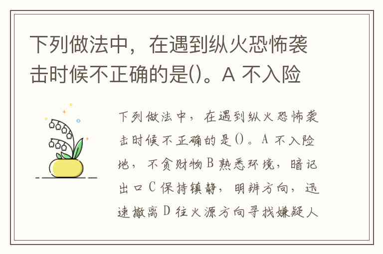 下列做法中,在遇到纵火恐怖袭击时候不正确的是()。A 不入险地,不贪财物 B 熟悉环境,暗记出口 C 保持镇静,明辨方向,迅速撤离 D 往火源方向寻找嫌疑人