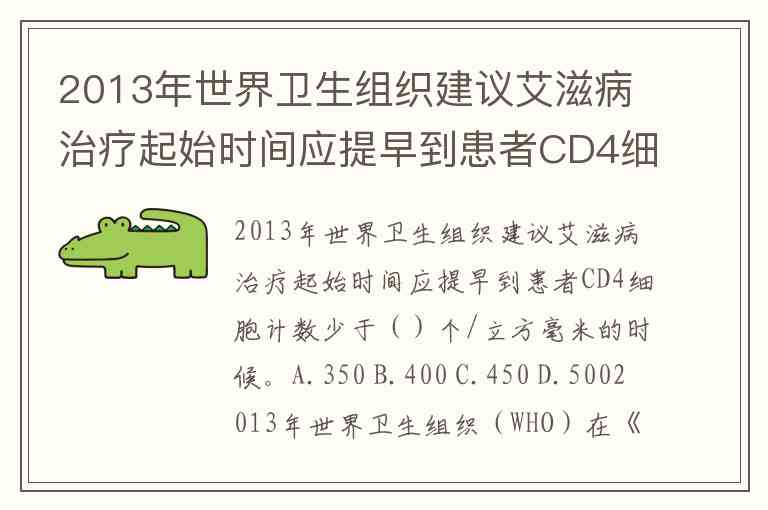 2013年世界卫生组织建议艾滋病治疗起始时间应提早到患者CD4细胞计数少于()个/立方毫米的时候。A.350 B.400 C.450 D.500