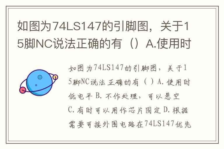 如图为74LS147的引脚图,关于15脚NC说法正确的有()A.使用时低电平 B.不作处理,可以悬空 C.有时可以用作芯片固定 D.根据需要可接外围电路