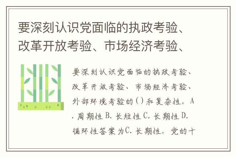 要深刻认识党面临的执政考验、改革开放考验、市场经济考验、外部环境考验的( )和复杂性。A.周期性 B.长短性 C.长期性 D.循环性