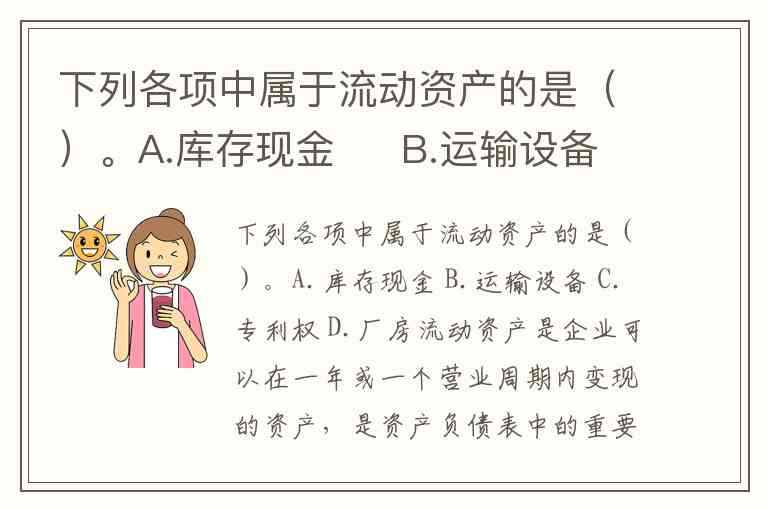 下列各项中属于流动资产的是()。A.库存现金 B.运输设备 C.专利权 D.厂房