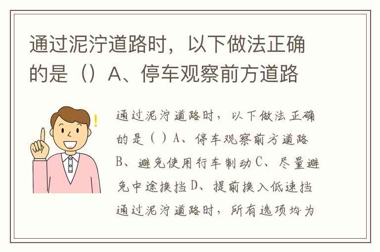 通过泥泞道路时,以下做法正确的是()A、停车观察前方道路 B、避免使用行车制动 C、尽量避免中途换挡 D、提前换入低速挡