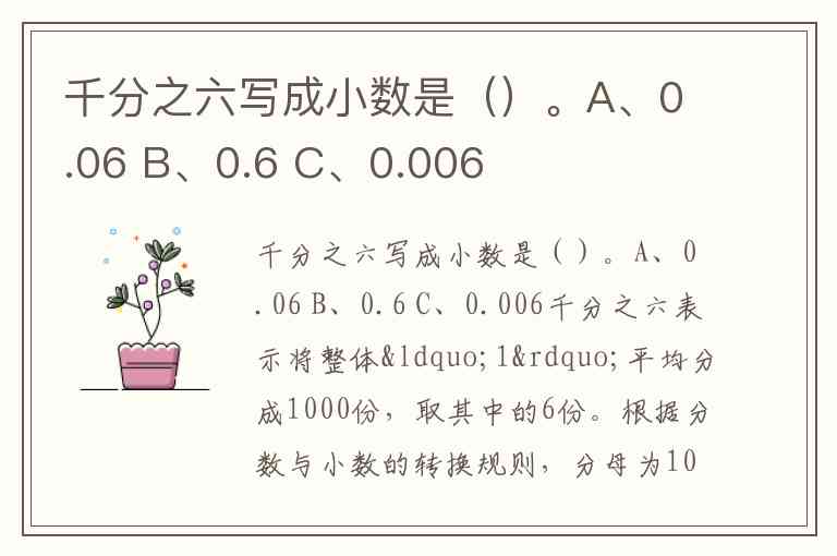 千分之六写成小数是()。A、0.06 B、0.6 C、0.006