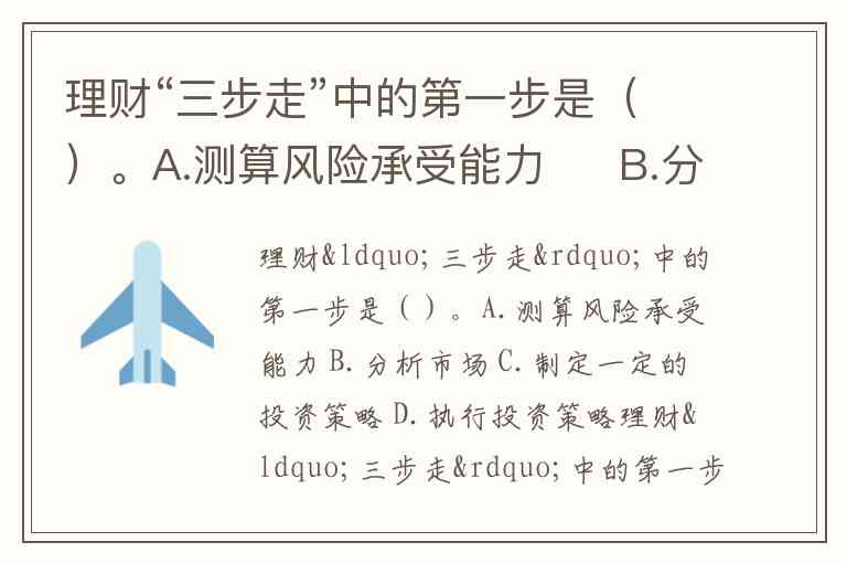 理财“三步走”中的第一步是测算风险承受能力(A选项)。这一步骤的核心在于通过评估个人财务状况、投资目标和心理承受能力,为后续投资决策奠定基础,避免因风险错配导致损失或决策偏差。