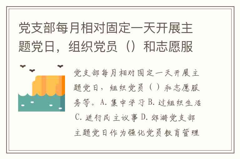 党支部每月相对固定一天开展主题党日,组织党员()和志愿服务等。A.集中学习 B.过组织生活 C.进行民主议事 D.郊游