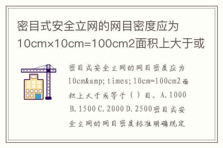 密目式安全立网的网目密度应为10cm×10cm=100cm2面积上大于或等于()目。A.1000 B.1500 C.2000 D.2500