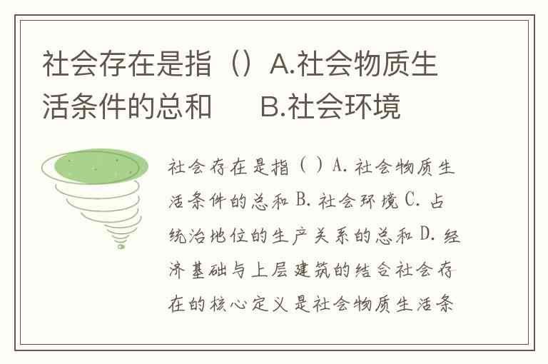 社会存在是指()A.社会物质生活条件的总和 B.社会环境 C.占统治地位的生产关系的总和 D.经济基础与上层建筑的结合