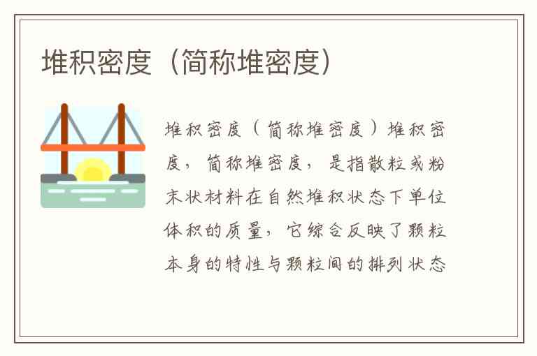堆积密度,简称堆密度,是指散粒或粉末状材料在自然堆积状态下单位体积的质量,它综合反映了颗粒本身的特性与颗粒间的排列状态。与真密度(绝对密实状态下的密度)不同,堆密度的数值中包含了颗粒内部孔隙和颗粒间空隙的体积,因此通常小于真密度。例如,面粉堆积时,不仅每颗面粉颗粒内部可能有微小孔隙,颗粒之间还会形成明显的空隙,这些都会使堆密度显著低于其真密度。