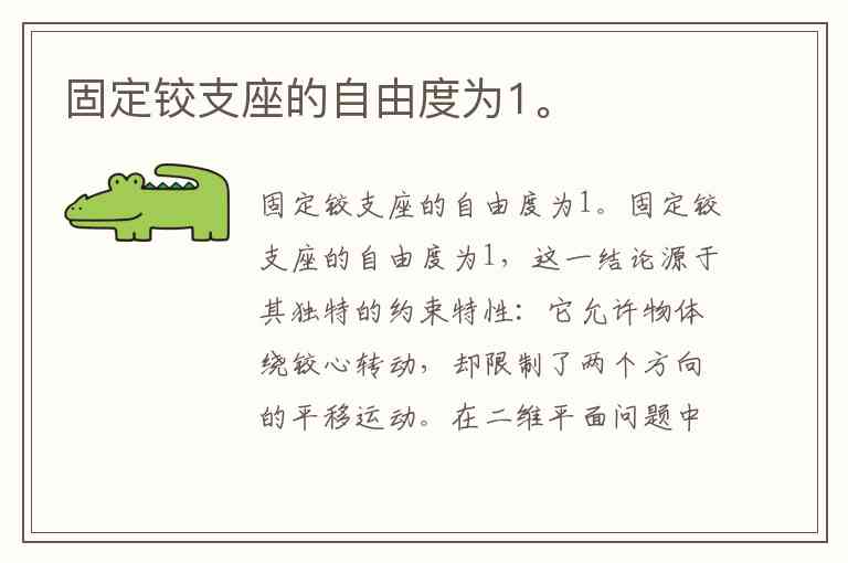 固定铰支座的自由度为1,这一结论源于其独特的约束特性:它允许物体绕铰心转动,却限制了两个方向的平移运动。在二维平面问题中,一个未受约束的刚体原本拥有3个自由度(x轴平移、y轴平移和转动),而固定铰支座通过限制x和y方向的平移,仅保留了绕铰链中心的转动自由度,因此最终自由度为1。