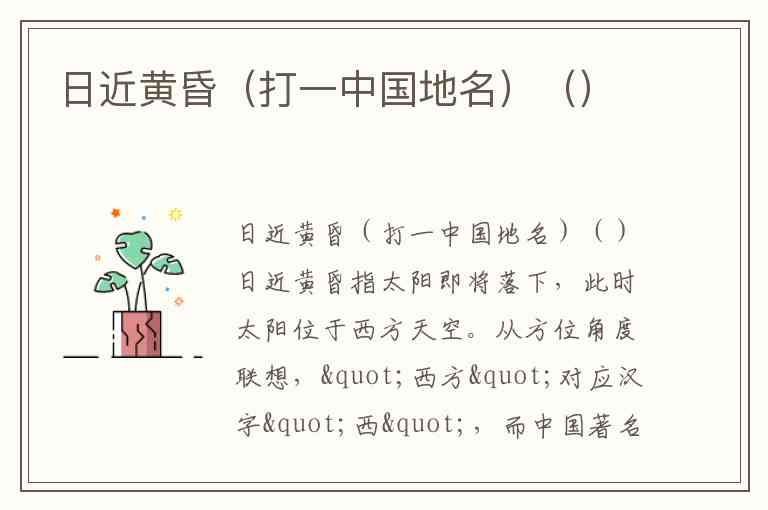日近黄昏指太阳即将落下,此时太阳位于西方天空。从方位角度联想,"西方"对应汉字"西",而中国著名古都"西安"中的"西"正契合"日落西方"的意象,因此答案为西安。