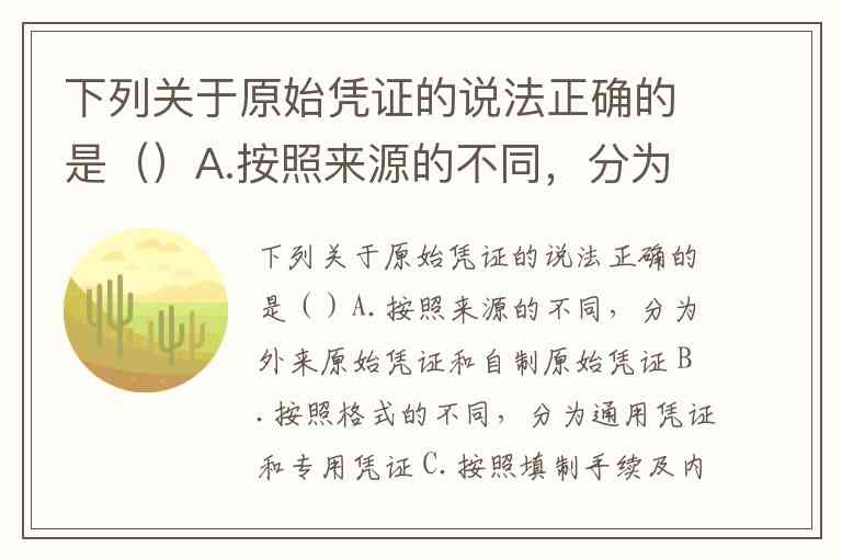 下列关于原始凭证的说法正确的是()A.按照来源的不同,分为外来原始凭证和自制原始凭证 B.按照格式的不同,分为通用凭证和专用凭证 C.按照填制手续及内容不同,分为一次凭证、累计凭证和汇总凭证 D.按照填制方法不同,分为外来原始凭证和自制原始凭证